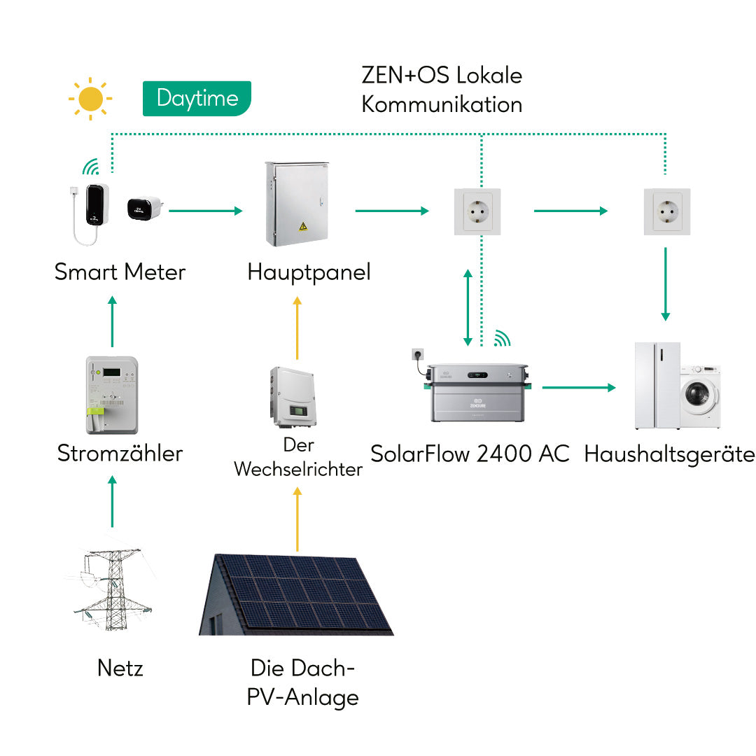 Par temps ensoleillé, le SolarFlow 2400 AC recharge la batterie grâce à des panneaux solaires et des onduleurs. Une fois les besoins en électricité du foyer couverts, l'excédent d'énergie solaire est automatiquement stocké dans les batteries. Au coucher du soleil ou lors des pics de prix de l'électricité, le système restitue l'énergie stockée, garantissant ainsi des économies maximales 24h/24 !