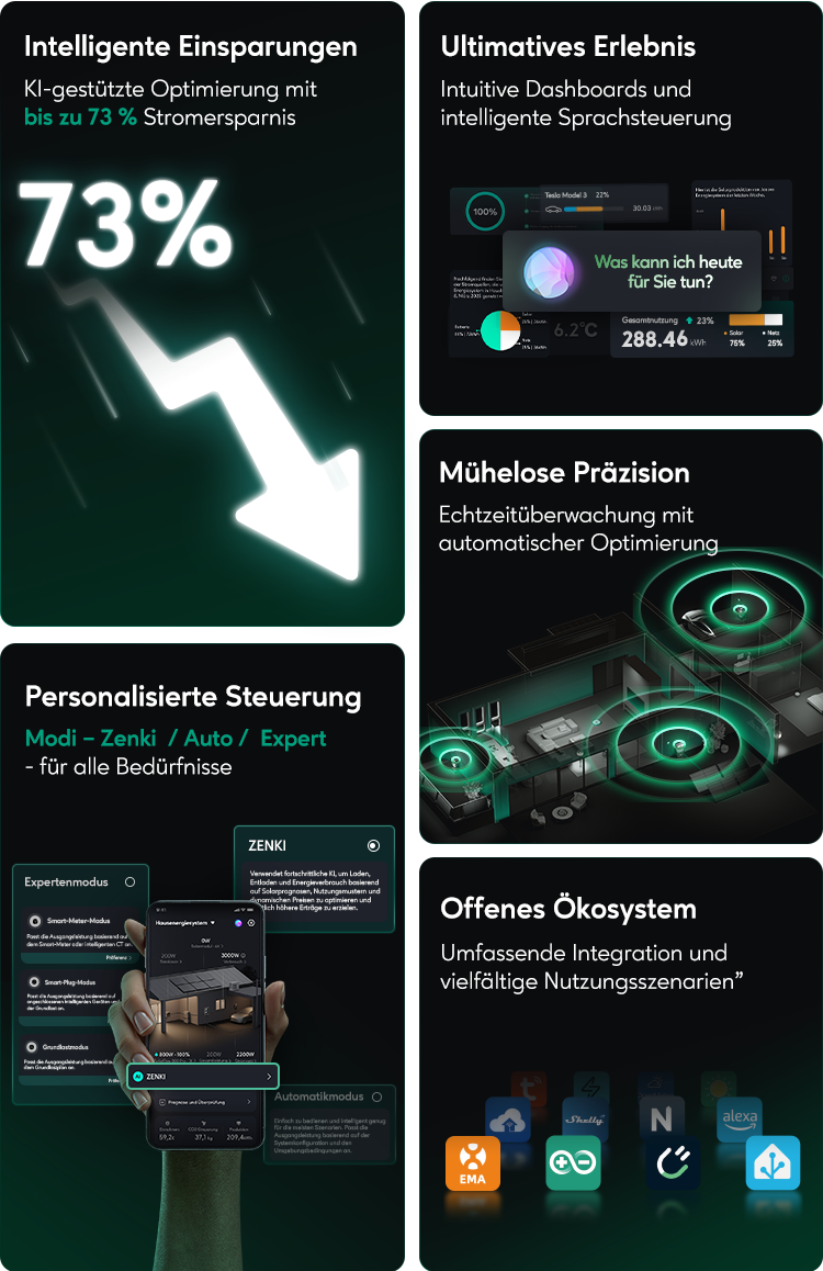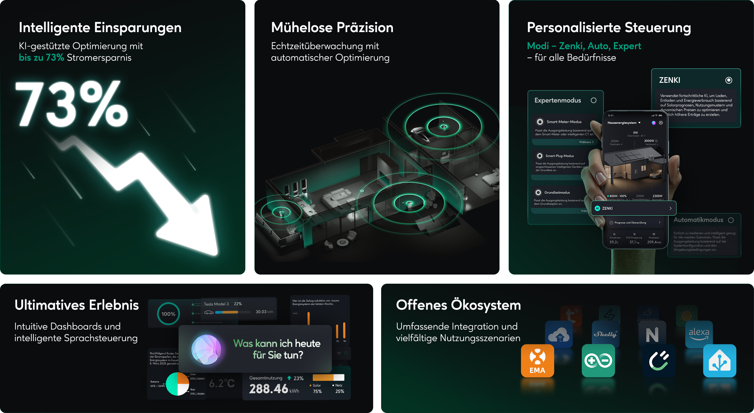 Die Zenki-KI optimiert den Energieverbrauch auf Grundlage von Echtzeit-Strompreisen, Wettervorhersagen und Verbrauchsgewohnheiten. Dabei wird saubere Energie priorisiert, um Kosteneinsparungen von bis zu 73 % zu erzielen.