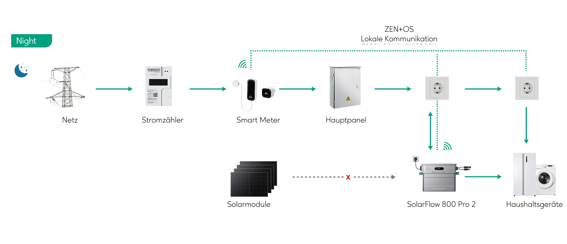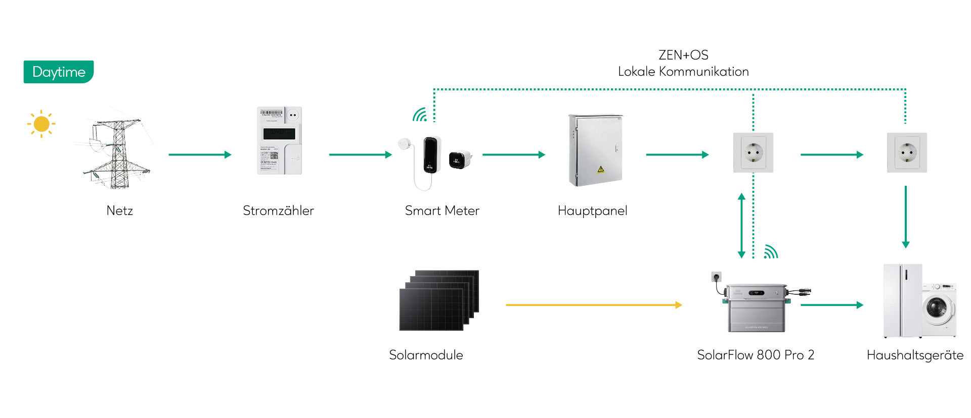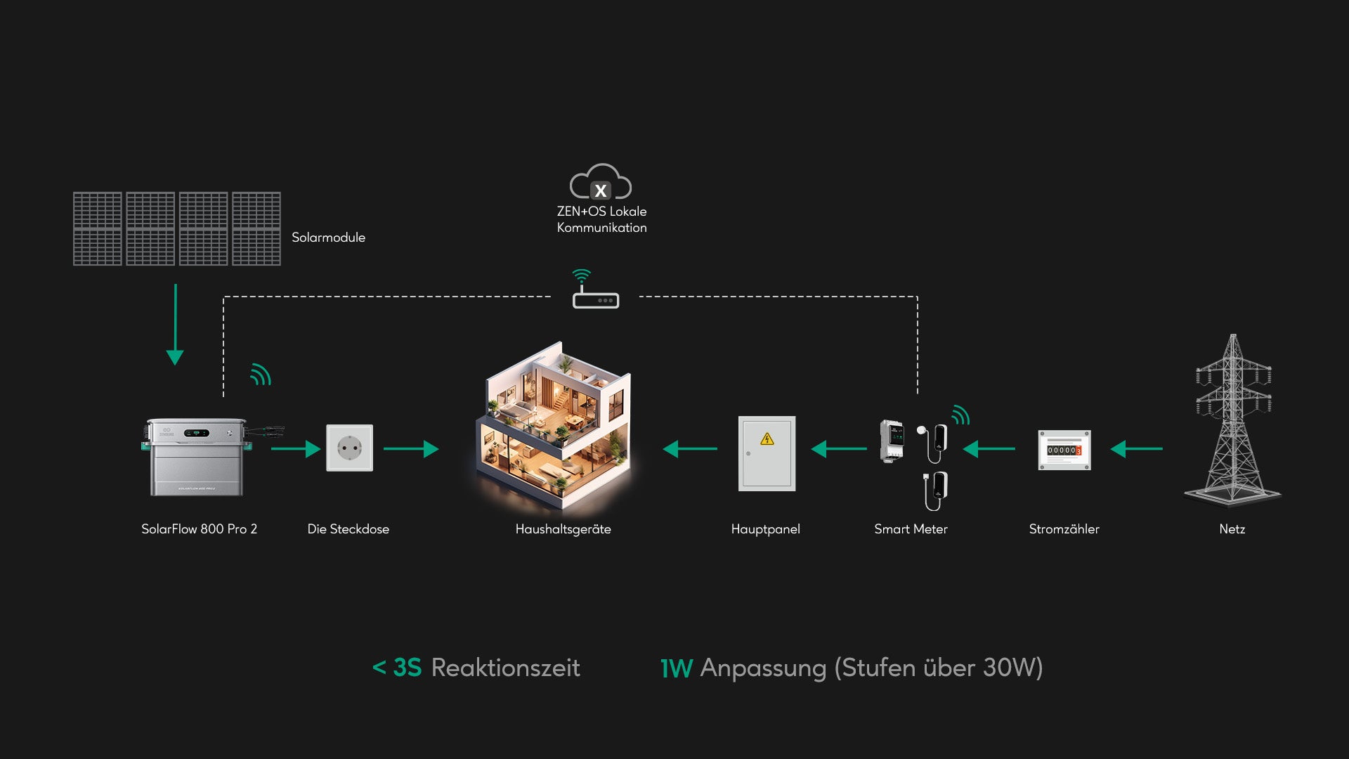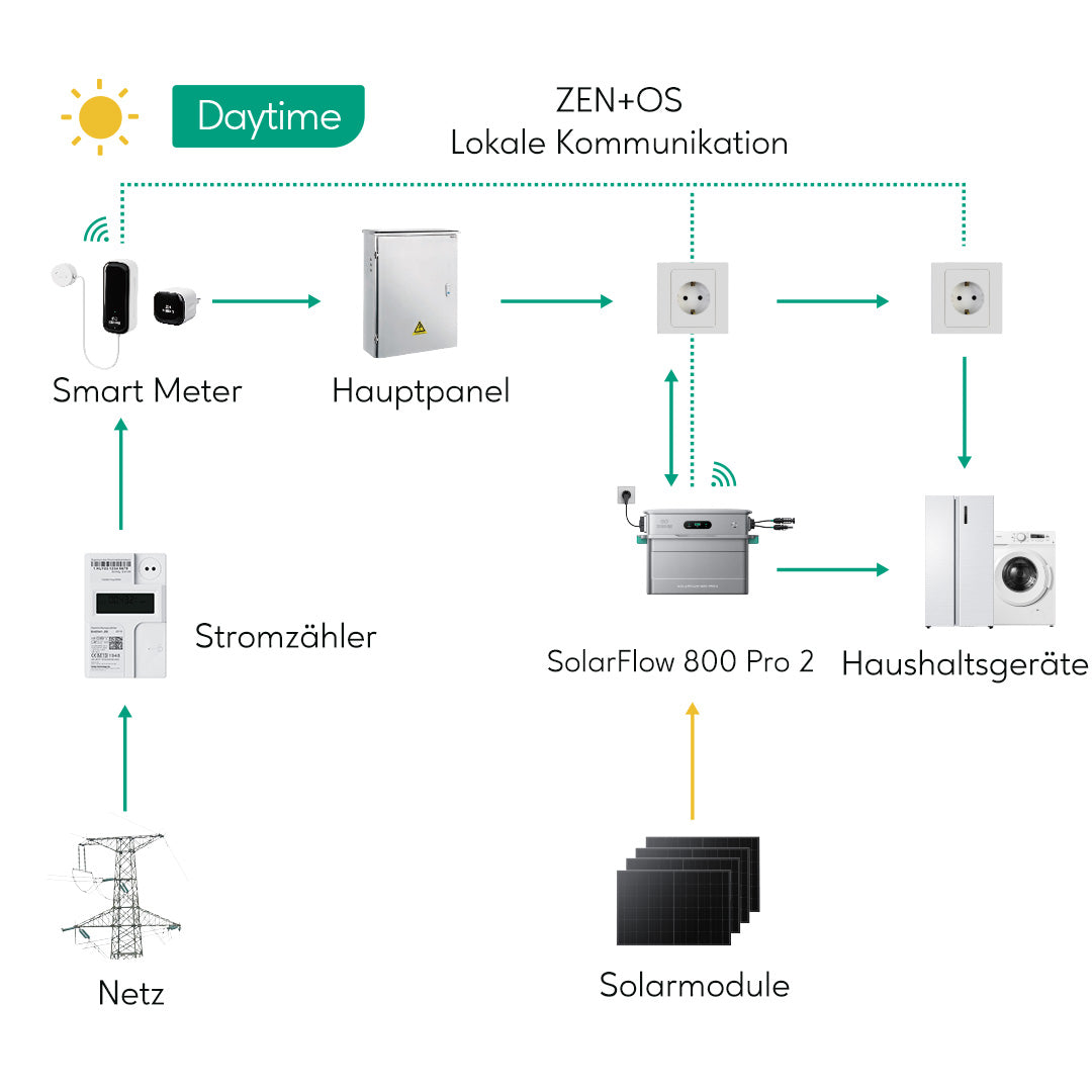 Erlebe die Leistung und den Komfort eines intelligenten Energiemanagements. Tagsüber versorgt der SolarFlow 800 Pro 2 dein Zuhause mit Solarstrom und speichert überschüssige Energie in der Batterie. Abends liefert die Batterie Strom zurück an dein Zuhause. Dieses effiziente Energiemanagement senkt deine Abhängigkeit vom Stromnetz – und spart dir bares Geld.